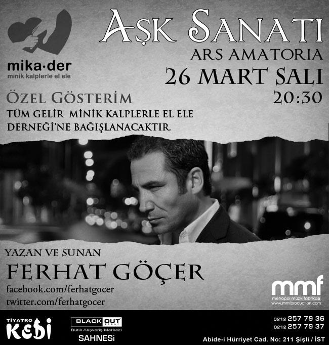 Değerli sanatçımız ve Dernek yönetim kurulu üyemiz Ferhat Göçer’in ‘Aşk Sanatı’ oyununun 26 Mart 2013 tarihindeki gösteriminin tüm geliri Mika-Der’e bağışlanmıştır.